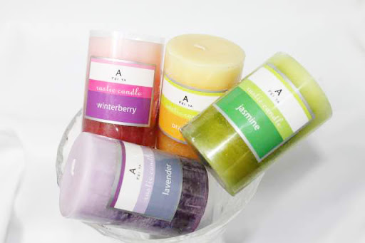 オレンジ、ウインターベリー、ジャスミン、ラベンダーの香りのアロマキャンドル4本セットです。サイズは直径が4.7cmで長さは7.5cmです。インド製。